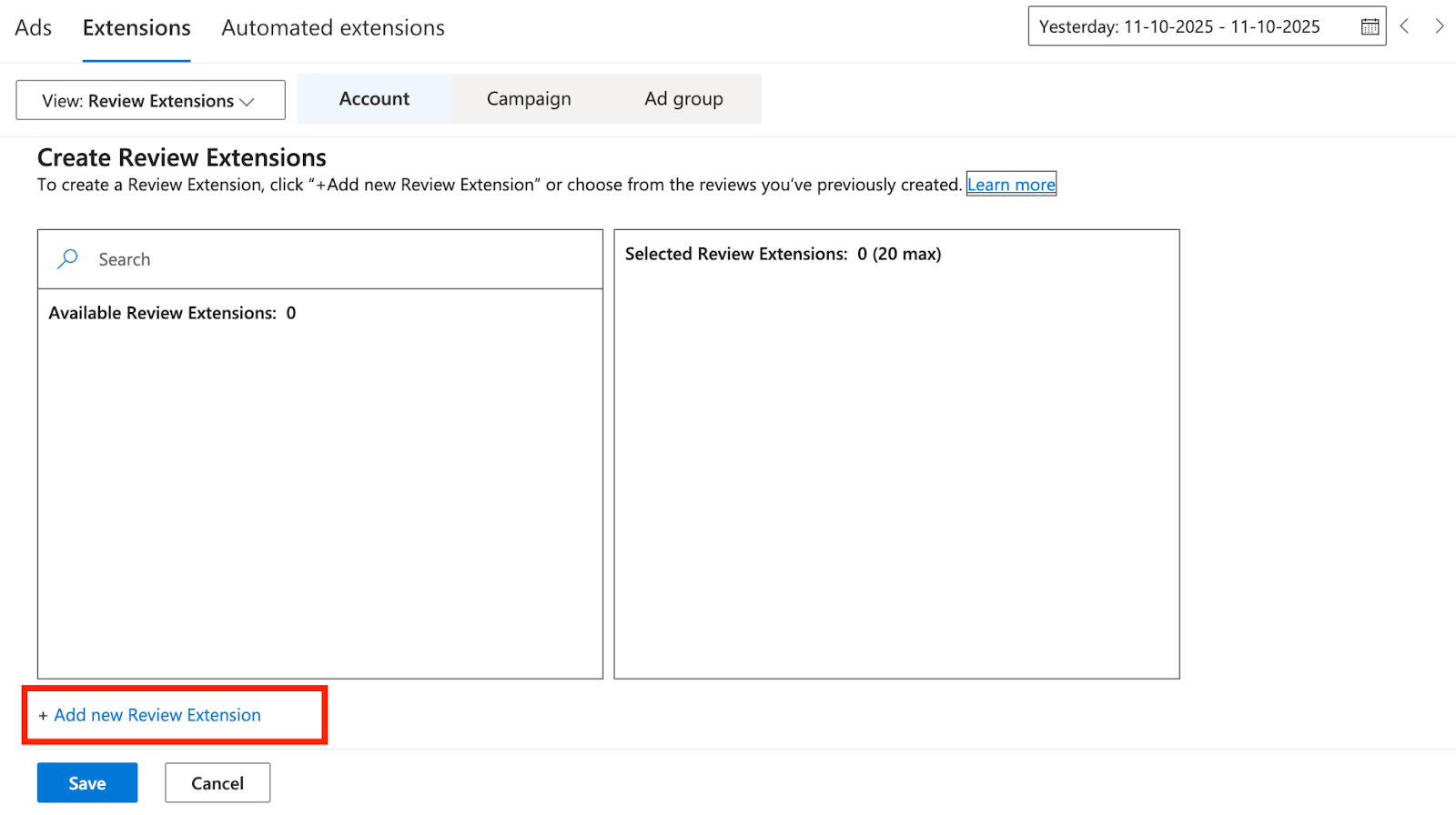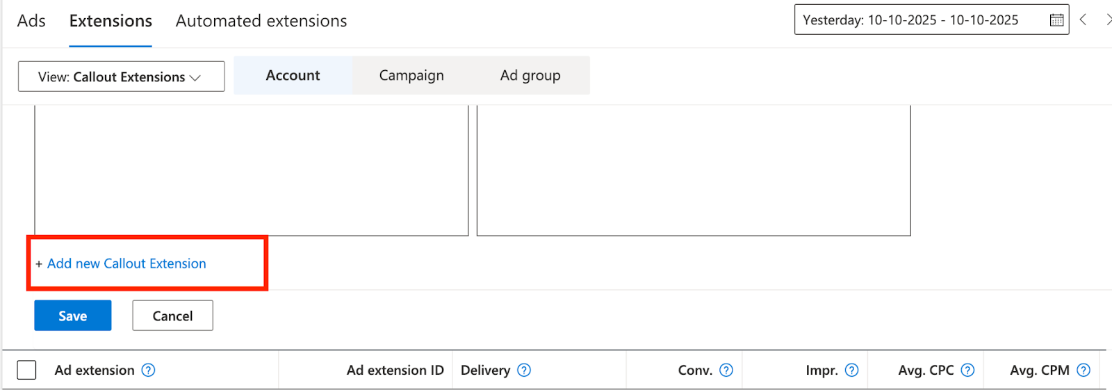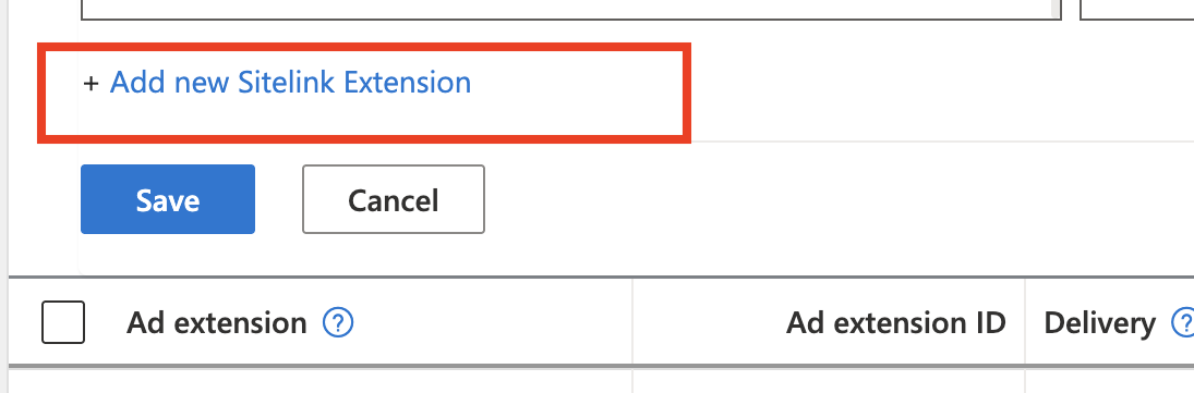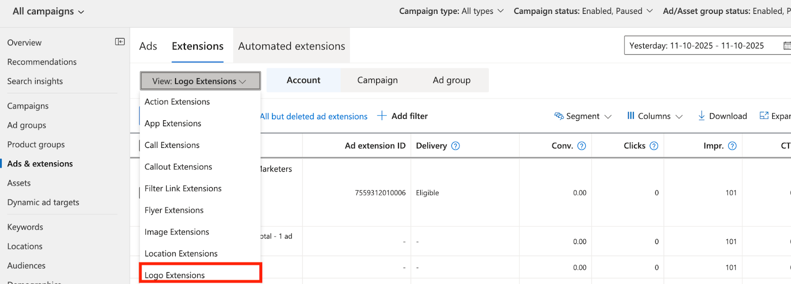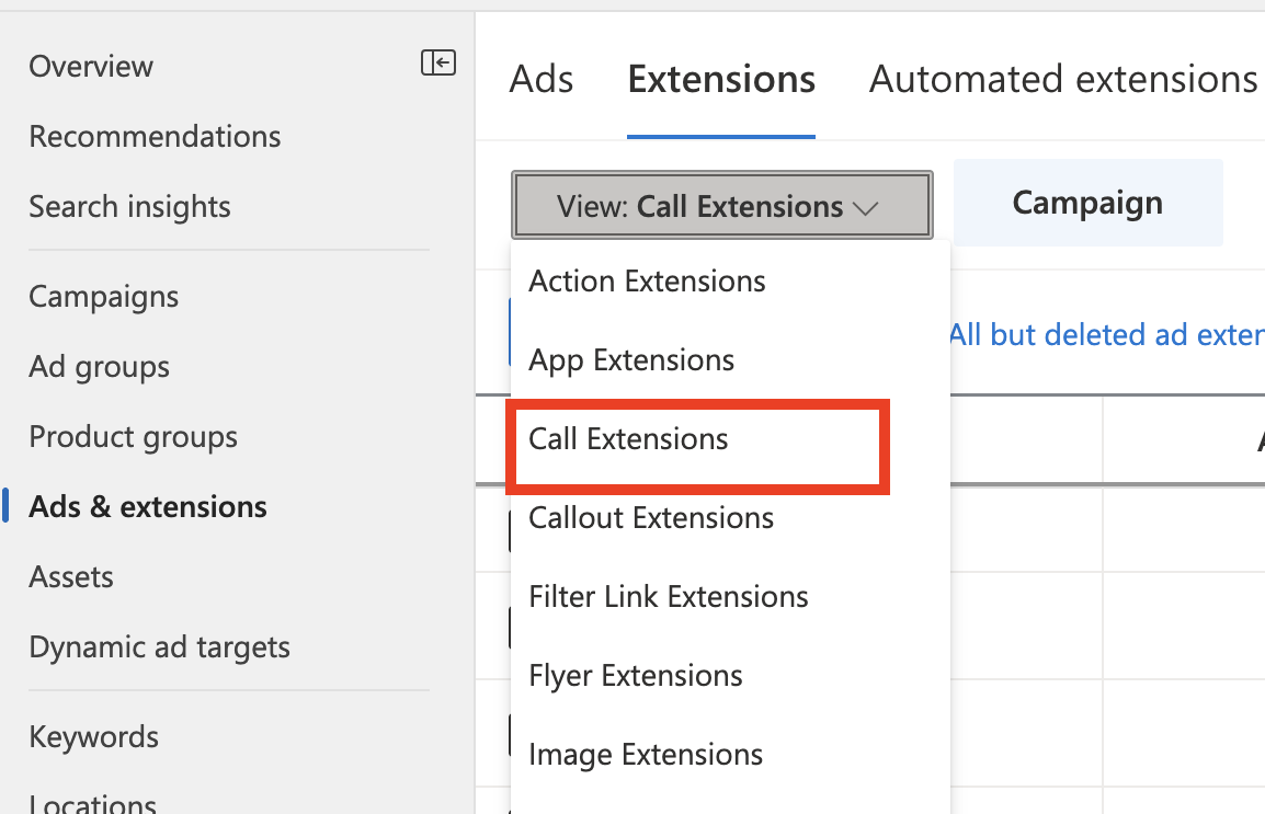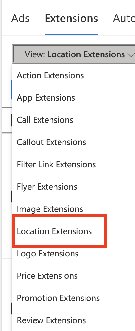 - Choose Extensions at the account or campaign level.