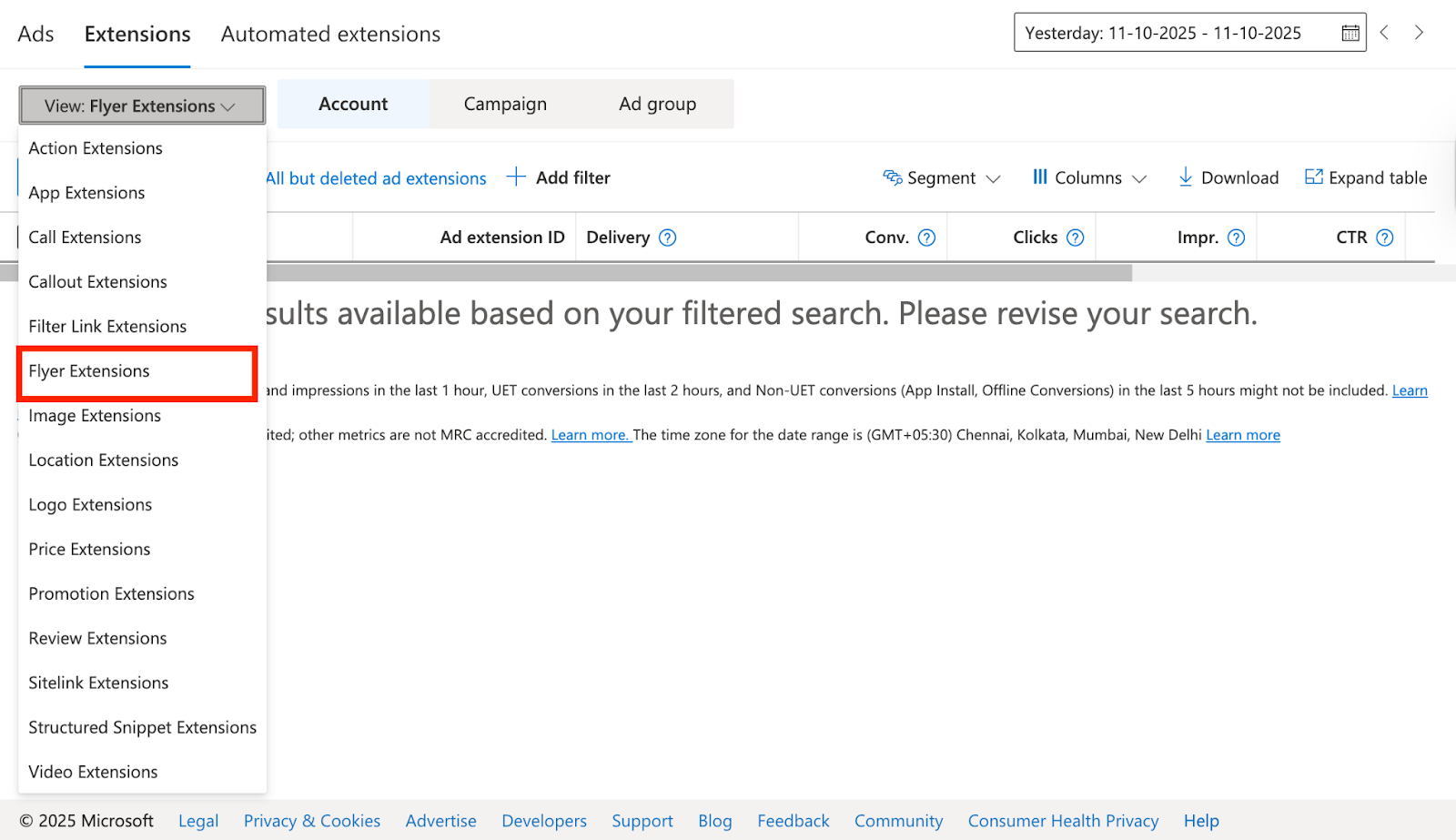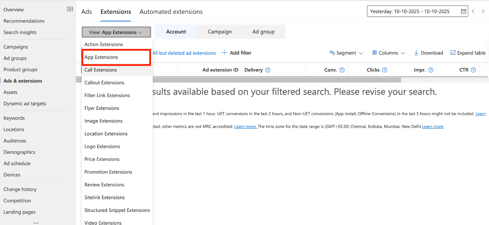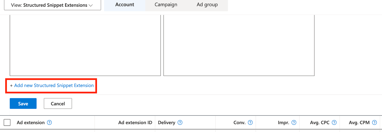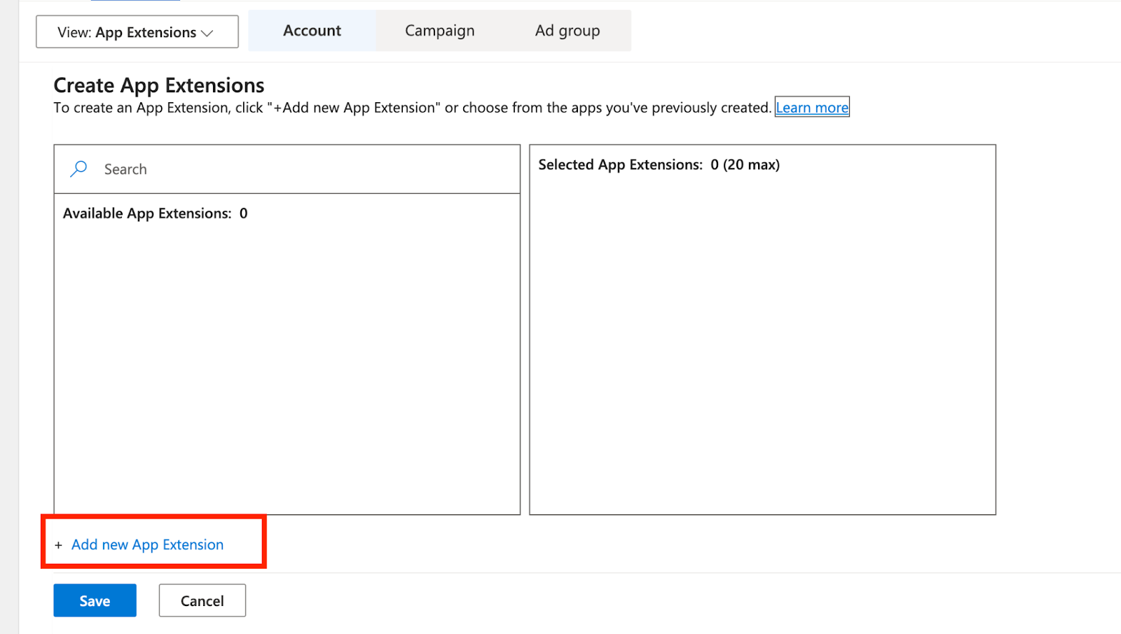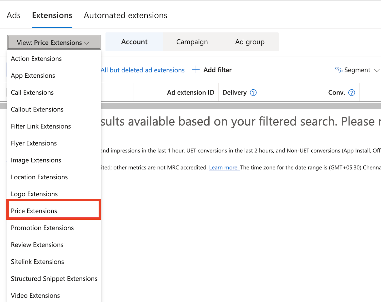 - Choose Extensions at the account or campaign level.