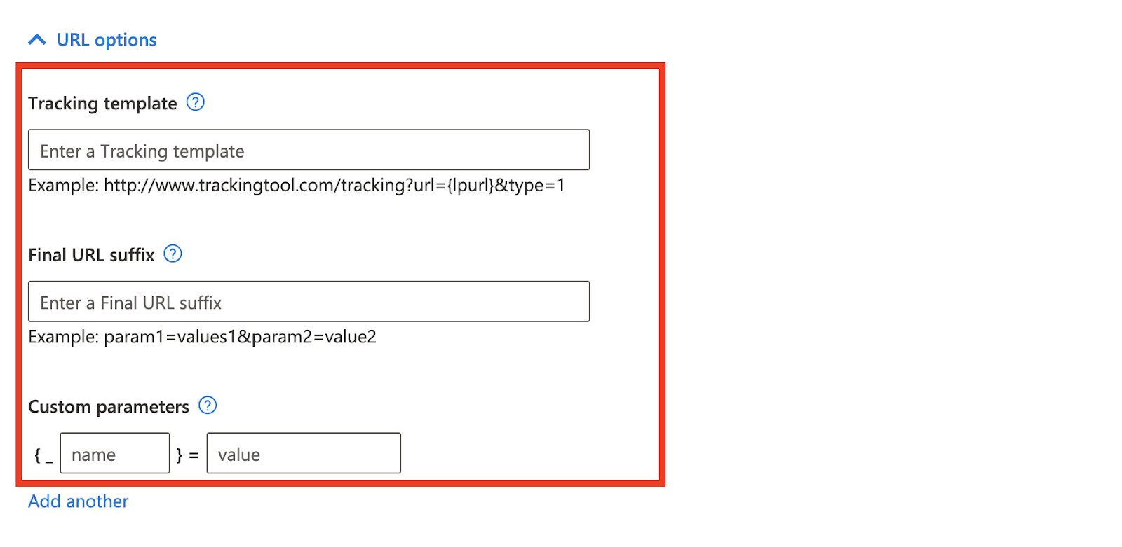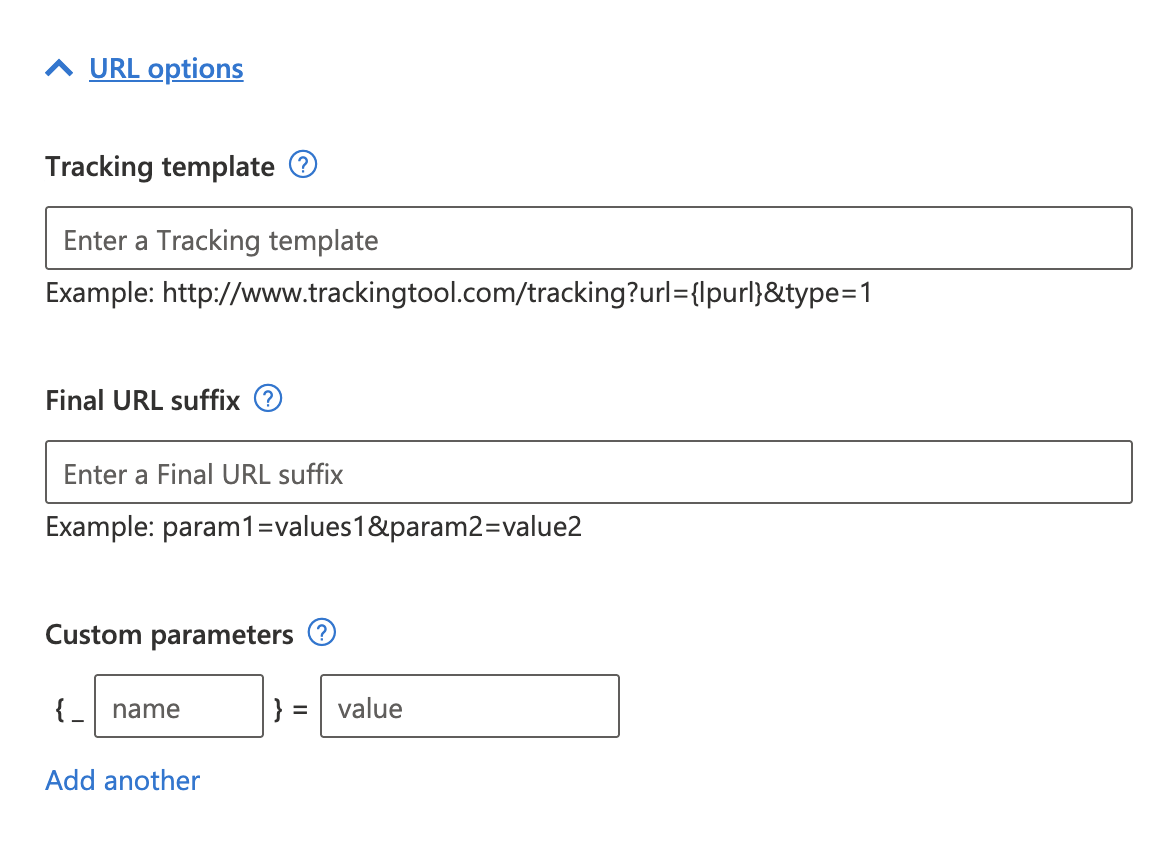 - Moving next, choose the URL options (Tracking template, Final URL suffix, or Custom parameters where you add name and variable)
