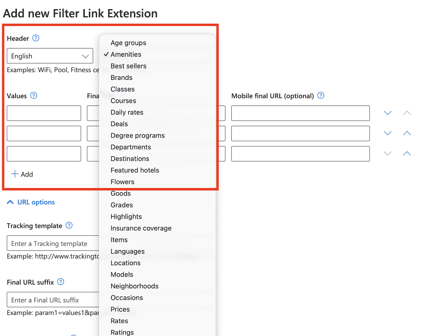 - Enter the respective value and final URL for each filter.