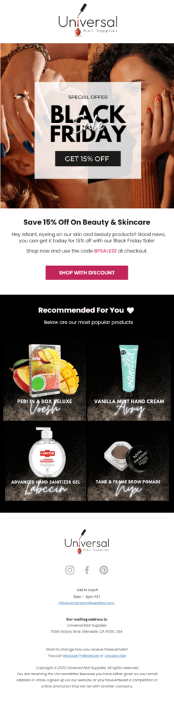 Universal Nail Supplies captures customer attention with eye-catching subject lines that prompt customers to click and take action. They used the following phrases as suggested below to improve open rate to boost sales during Black friday: