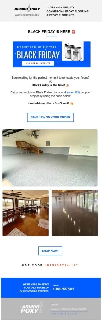 Armorpoxy sales surged after we implemented a thoughtful email marketing campaign, helping them stand out. Here you can see the combination of personalized messaging, an attractive design, and clear offers that drive attention and boost conversions.