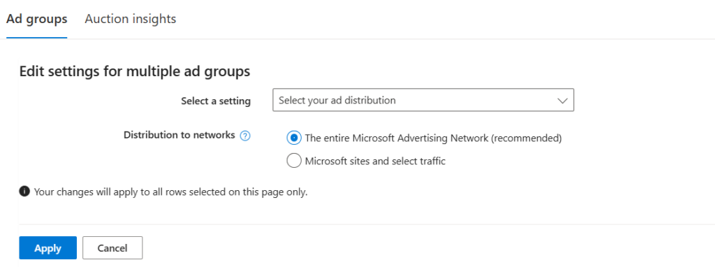 - In the settings box, select Select Your Ad Distribution, choose Microsoft sites, and select Traffic, as this option offers you everything except the Syndicated Search Partners.